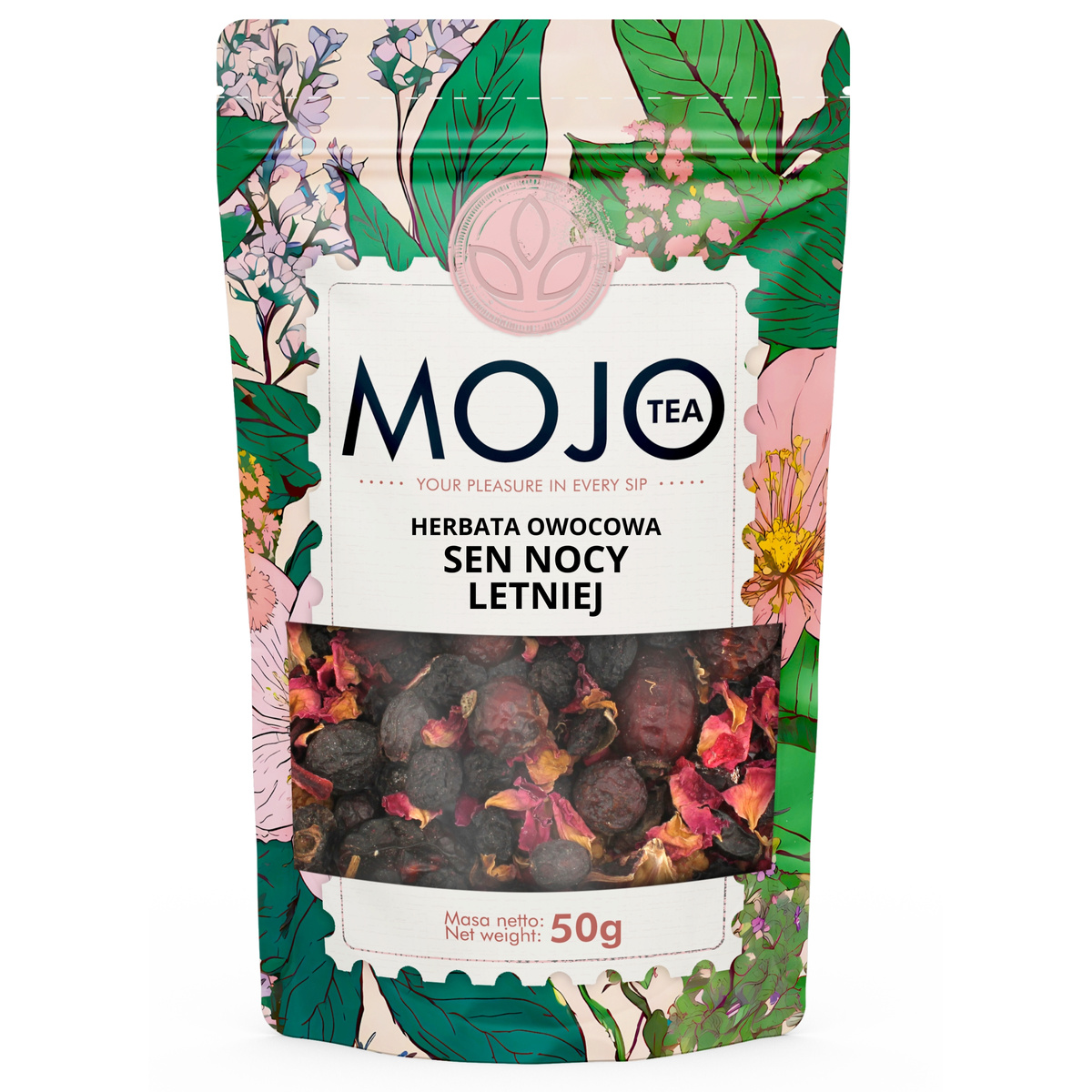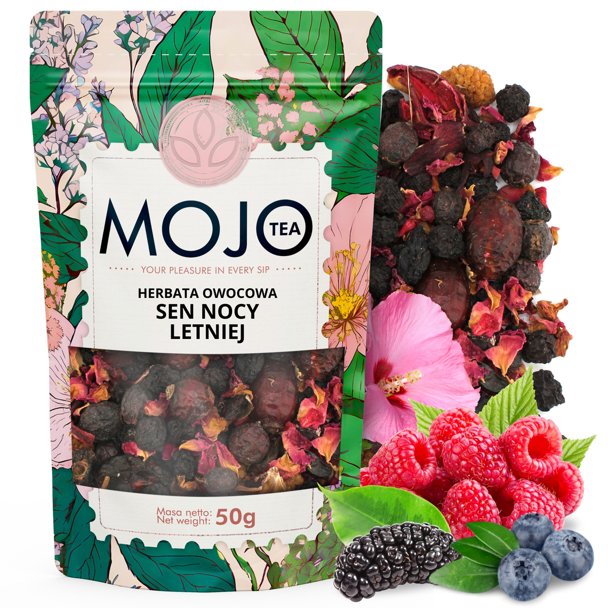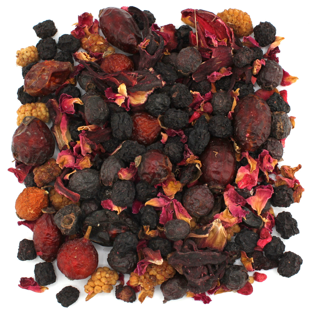 Pyszna mieszanka owocowa na bazie leczniczych i nieocenionych w swym działaniu owoców: dzikiej róży, głogu i aronii, wzbogacona nieco kwaskowatym hibiskusem (hibiscus), słodyczą owocu morwy i korzenia lukrecji. Kompozycja zastała wzbogacona jeszcze dodatkiem pachnących słońcem owoców jagody i maliny. Wystarczy zerknąć na ten wspaniały skład! Sam wygląd suszu zachęca i obiecuje przyjemne doznania smakowe.