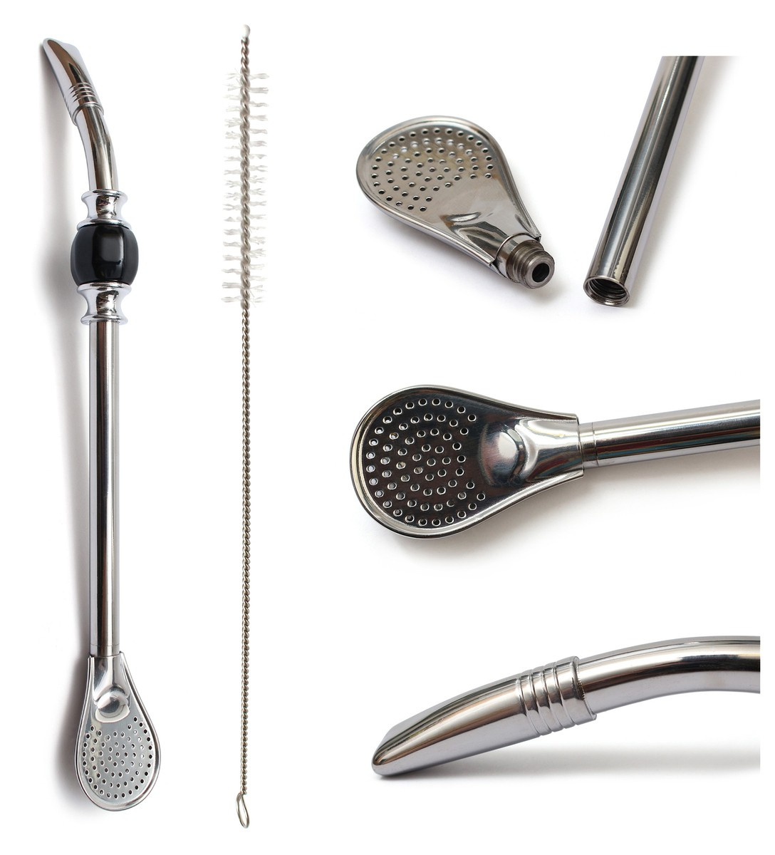 Długość bombilli to 22 cm. W zestawie ze szczoteczką 21 cm. Myć wodą z detergentem. Zalecane jest czyszczenie za pomocą szczoteczki do czyszczenia bombilli. Zakończona odkręcanym sitkiem. Estetyczny model zdobiony żłobieniami na ustniku oraz dwoma pierścieniami chłodzącymi pomiędzy którymi umieszczony jest czarny kamień. Niezawodna bombilla wykonana ze stali najwyższej jakości. Do każdego rodzaju yerba mate. Bombille tego typu mają bardzo mocno wypolerowane ustniki. Do bombilli dołączona jest praktyczna szczoteczka do czyszczenia bombill.