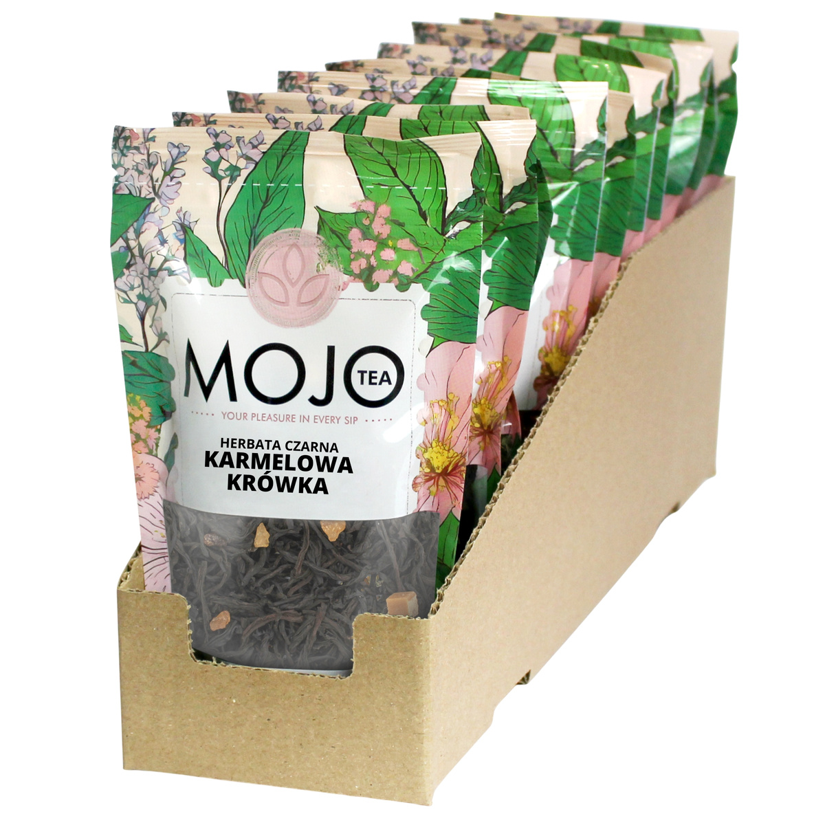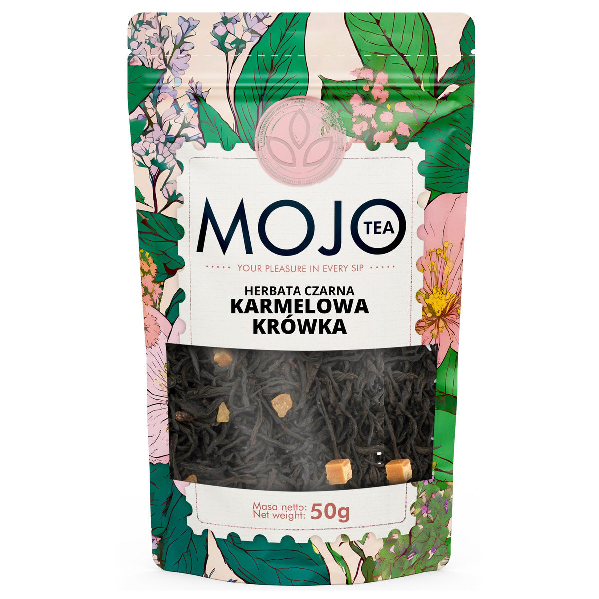 Herbata Karmelowa krówka to prosta, ale zdecydowanie bardzo przyjemna w smaku kompozycja o intensywnym aromacie. Tym razem czarna herbata liściasta - tak bardzo ceniona od wieków na półwyspie indyjskim, potem całym imperium brytyjskim - w połączeniu z cukrem palonym i małymi kawałkami toffi, podkreślona karmelowym aromatem.