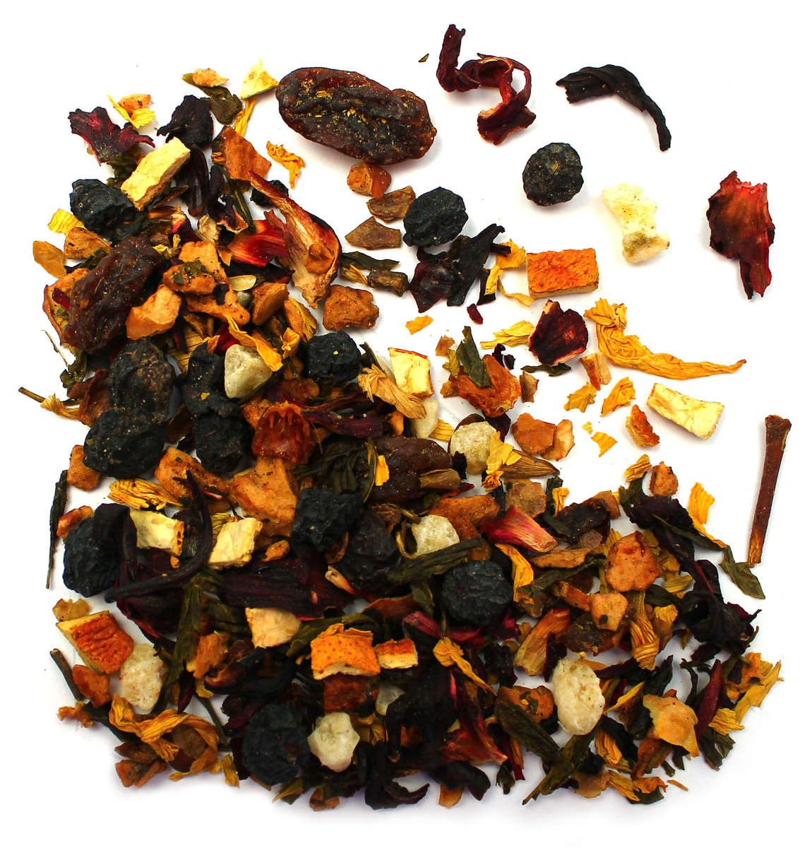 Znajdziesz tu kwaskowaty hibiskus, słodkie jabłko, intensywną aronię, czarny bez, tarninę oraz owoc i skórkę dzikiej róży. Całość wzbogacają soczysta wiśnia i dojrzała śliwka, a także naturalna słodycz rodzynek. Wyjątkowego aromatu i świeżości dodają płatki słonecznika oraz skórka pomarańczy, która wprowadza subtelną cytrusową nutę. Całość dopełniają starannie dobrane aromaty, które podkreślają owocowy charakter naparu.