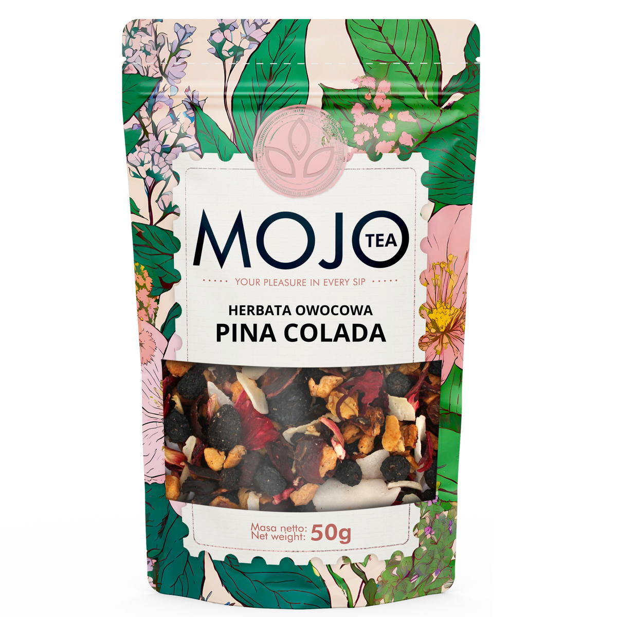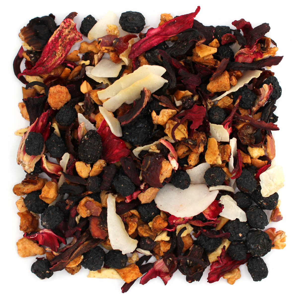 Mieszanka suszonych owoców o intensywnym smaku i aromacie ananasowo - kokosowym. W jej bogatym składzie odnajdziemy: chipsy kokosowe oraz kawałki ananasa, słodkie jabłko, kwaskowaty hibiskus i lekko cierpką aronię, leczniczy owoc bzu czarnego, tarniny i skórka owocu dzikiej róży. Herbatkę wzbogacają kwaśna i soczysta wiśnia oraz czarna porzeczka, a także słodkie rodzynki i śliwka, które dodają tej kompozycji zdecydowany, charakterystyczny posmak. Smak tej mieszanki dopełniają aromaty. Kokos i ananas sprawiają, że ma ona egzotyczny charakter, natomiast reszta owoców poszerza głębię smaku tej herbaty o wiele subtelnych tonów.