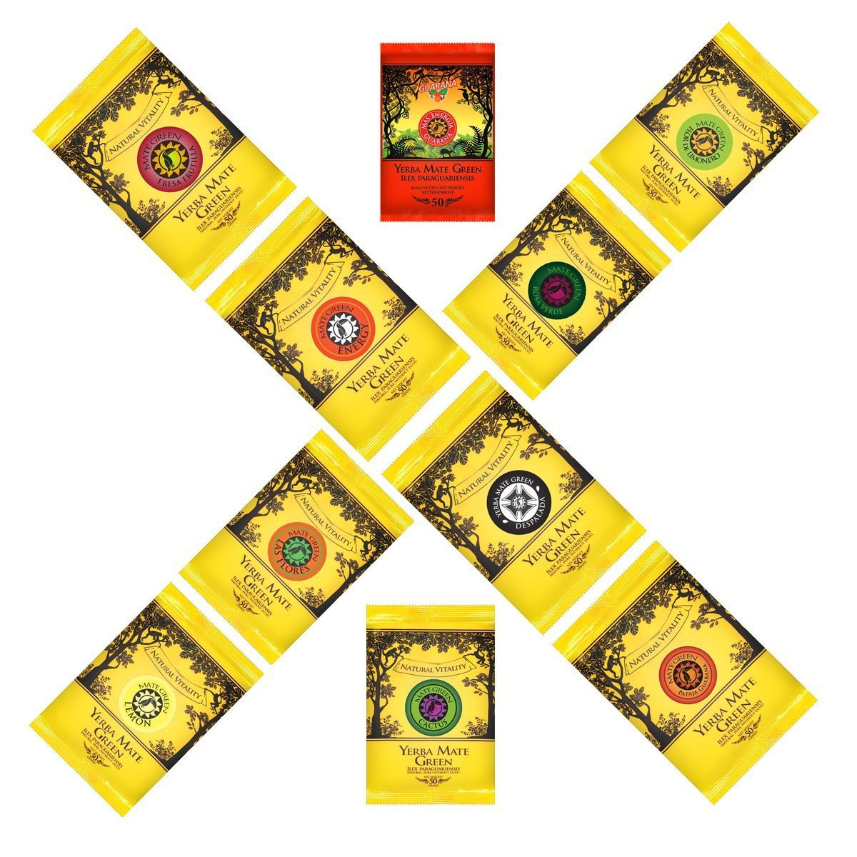 - Zestaw próbek 10x50g: Mate Green Rosa Verde, La alma pura, Papaja Guarana, Mas Energia Guarana, Flor De Limonero, Energy, Limon, Cactus, Fresa Frutilla, Despalada