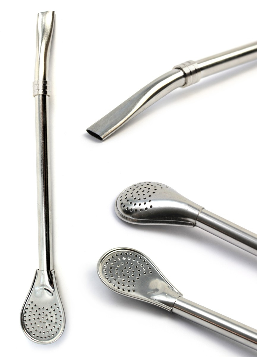 • Profilowana, nierdzewna rurka z szerokim sitkiem w kształcie i wielkości łyżeczki. Zdobiona srebrnym pierścieniem chłodzącym. Pasuje do większości naczyń z tykw i ceramiki. Bardzo dobrze filtruje. Długość 19 cm.