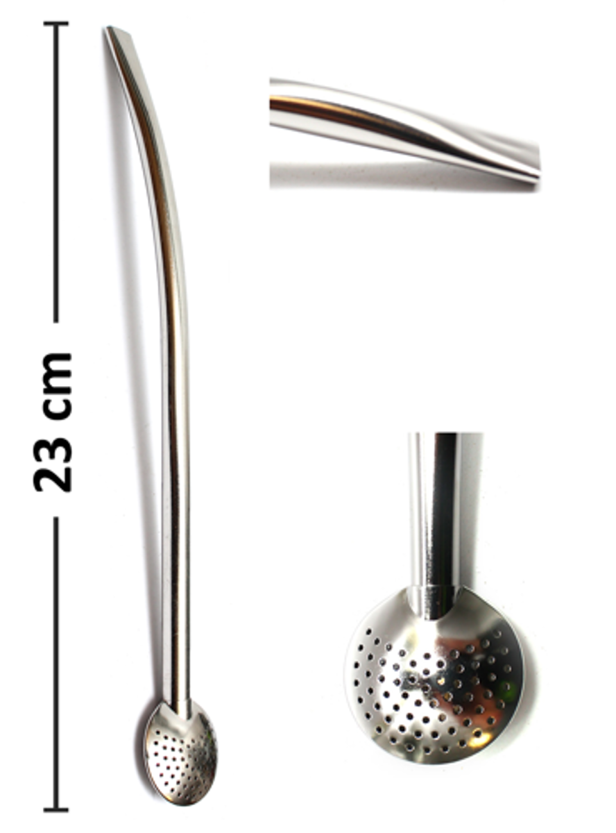 Wygięta z płaskim ustnikiem, idealna do picia z naczyń porongo, dzbanków i termosów, zakończona płaskim 3 cm sitkiem o blisko 200 dziurkach.