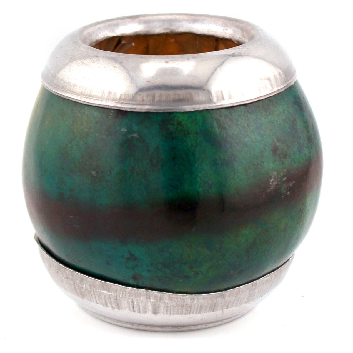 Klasyczne matero - Tykwa Argentina podwójnie okuta - zielona z dekoracyjnym podwójnym aluminiowym okuciem.