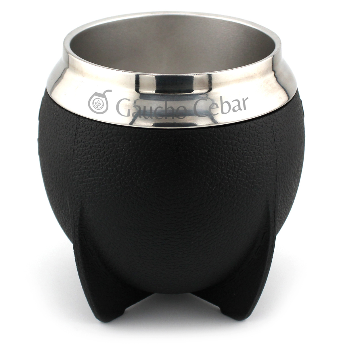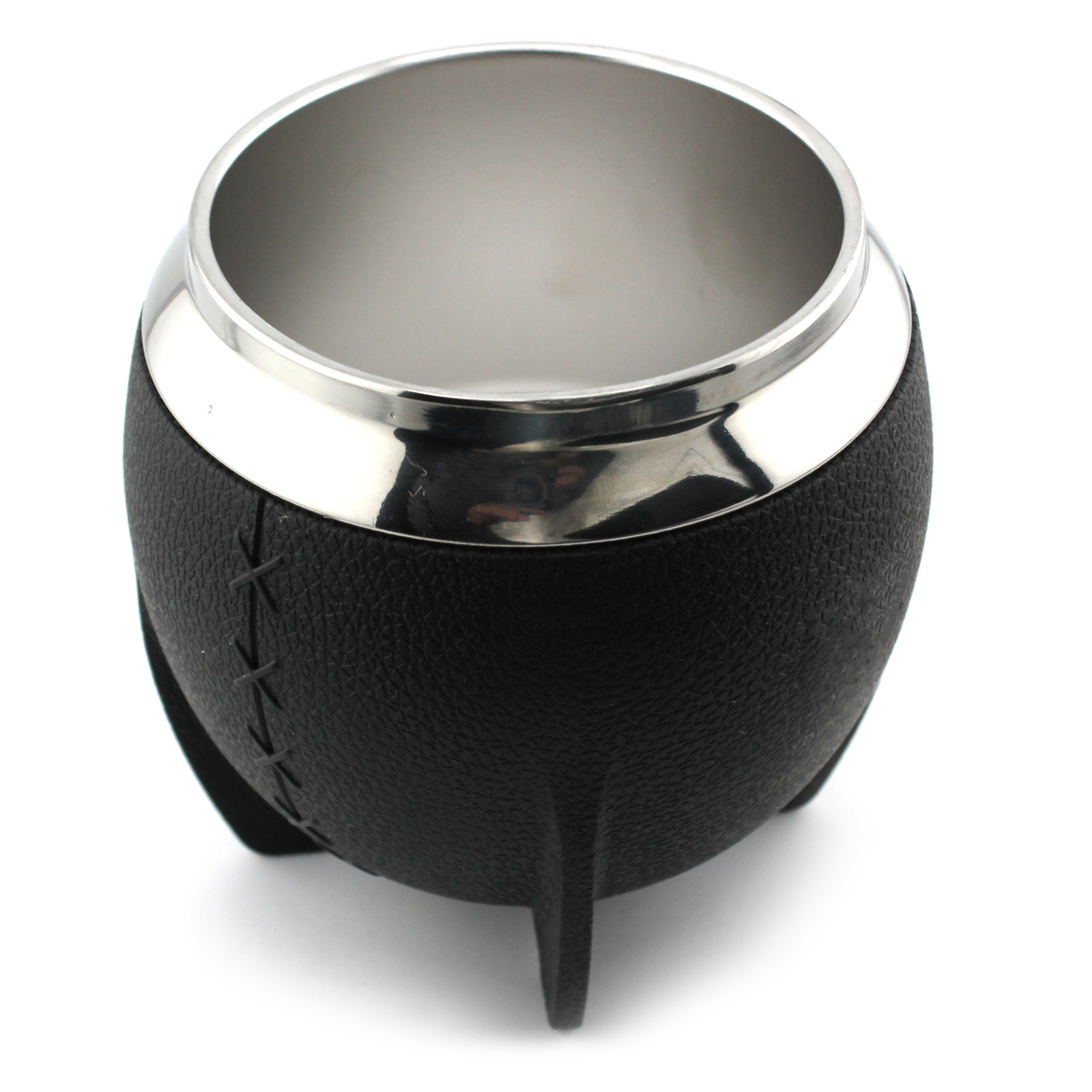 Stalowy środek otoczony jest miłym w dotyku materiałem przypominającym skórę. Oprócz wrażeń estetycznych zwiększa on również praktyczność naczynka: dzięki swojej teksturze zapewnia lepszy chwyt, a wzorowane na tradycyjnych tykwach "nóżki" stabilizują naczynko.